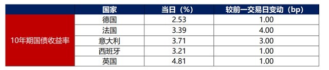 1月9日,主要欧洲经济体10年期国债收益率普遍上行。其中,德国10年期国债收益率上行3bp至2.53%,法国、意大利、西班牙、英国10年期国债收益率分别上行4bp、3bp、1bp和1bp。