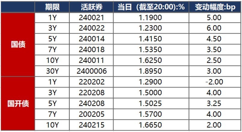 1月9日,受监管约谈机构以及指导债券交易传闻等利空因素影响,债市明显回调。截至北京时间20:00,10年期国债活跃券240011收益率上行2.5bp至1.6250%,10年期国开债活跃券240215收益率上行2.00bp至1.6650%。